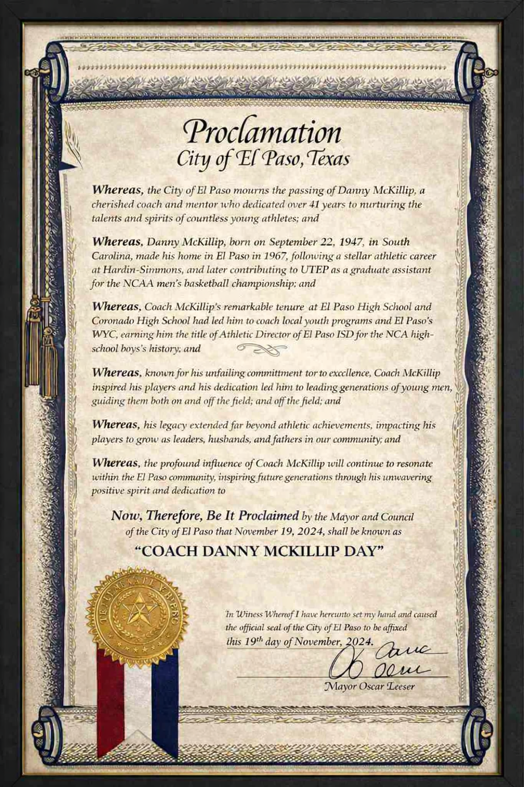 - Coach Danny McKillip Day: Proclaimed by the City of El Paso in November 2024.