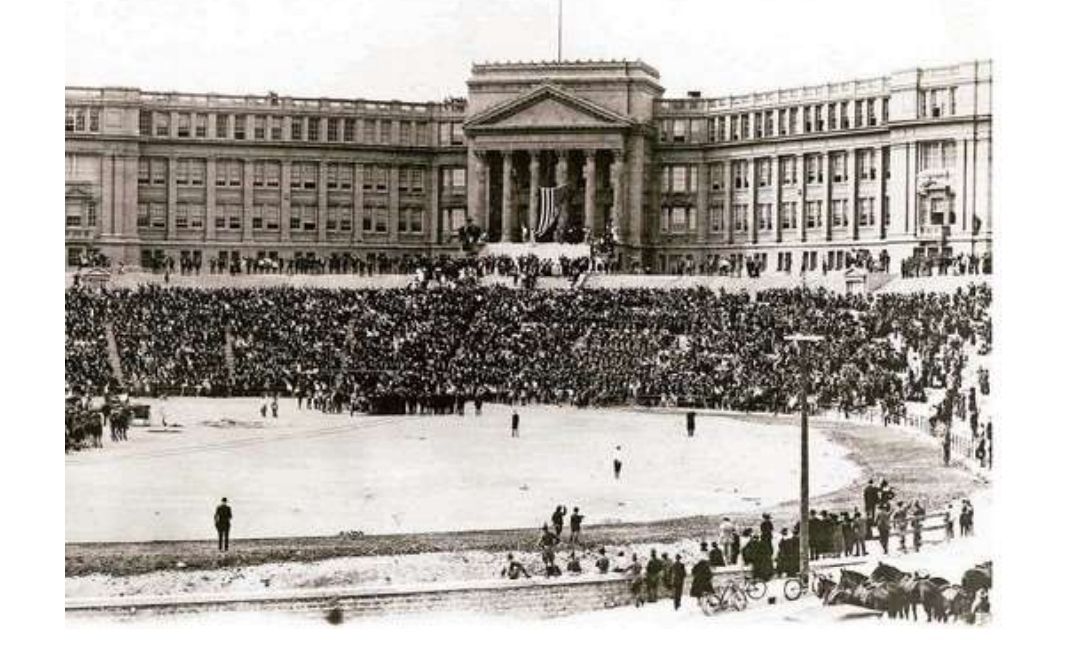A joyous crowd gathers at El Paso High School Stadium to celebrate the end of World War I