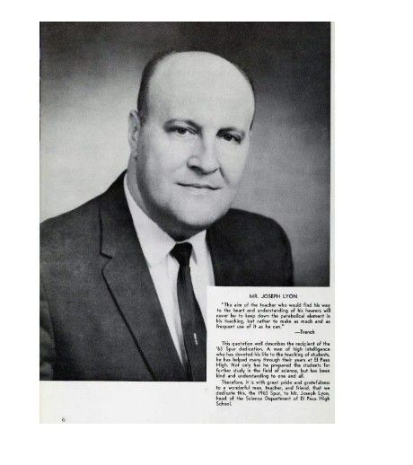 Joseph G. Lyon dedicated his career to serving the students of El Paso High School and science students throughout the district for more than 30 years. He emigrated to the United States from Lebanon to study animal sciences at New Mexico State University, graduating with a B.S. degree. He later studied at UT Austin where he was awarded a fellowship in sciences and earned a master's degree in education from Texas Western College. Mr. Lyon began teaching biology and physiology at El Paso High, impacting the lives off hundreds of science students. He loved his students, many of whom pursued professions in the sciences and medical field. He had a legacy at El Paso High with his father, Dr. George J. Lyon, a dentist, having studied there as a young man for a time in the early 1900s. Mr. Lyon's wife, Matilda Mowad Lyon, graduated from El Paso High in 1942 as a 16-year-old who went on to obtain her bachelor's and master's in education from Texas College of Mines. She taught in the El Paso Public Schools for more than 40 years. His daughter, Sandra Lyon Collins, also attended El Paso High and graduated in 1975. His other children are Richard G. Lyon, DDS, and SusanJoan Lyon. After years of dedication to his students at El Paso High, Mr. Lyon accepted an administrative position with El Paso Independent School District as Manager of the Live Material Center, overseeing the hands-on aspect of science in every classroom in the district. He maintained a greenhouse, raising starter cultures for science labs and overseeing the breeding, care and distribution of animals and plants to local schools. Mr. Lyon stayed updated on federal and state regulations regarding endangered or protected species, teaching proper handling techniques to teachers. He was known for his affectionate and gentle manner with the animals and students alike. Mr. Lyon was involved in many aspects of education. He served as President of the Board of the Teachers Federal Credit Union and El Paso Teachers Association, serving several terms on the board of each organization. He worked tirelessly to improve the lives of his students and fellow teachers by volunteering his time to causes that served others. He was a decades-long active member and Past President of the East El Paso Lions Club and a Vestry member of the Church of Saint Clement, and a small group leader with his wife for many years at his church. Mr. Lyon was a skilled violinist, having played since childhood and even performing professionally. He also maintained his Lebanese culture by playing the violin and oud (lute) at many cultural gatherings, surrounded by his large extended family and many Lebanese and Syrian friends. He served in World War II and grew up speaking and writing in four languages, including English, Arabic, French and Spanish. He acted as a translator on many occasions and translated documents from Arabic to English for numerous immigrants who settled in El Paso. Mr. Lyon retired from El Paso Independent School District in 1987 after more than 30 years of service and continued to meet former El Paso High students wherever he went. He had a deep connection with them and carried his happy memories of his science room on the fourth floor with him for the rest of his life.
